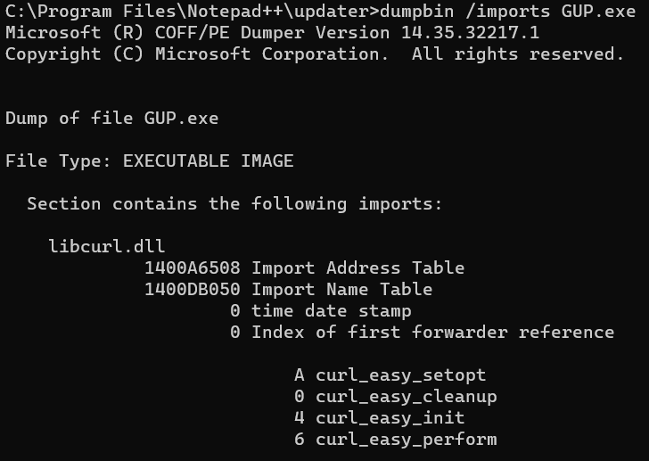 As you can see in Figure 1 the parent process of GUP.exe is notepad++.exe. Now it’s time to see if we can DLL sideload it. My favorite way to see if a binary can be sideloaded is to use the Developer Command Prompt Tools. The command dumpbin can be used to dump certain contents of a binary. For this situation, we want to see what the binary GUP.exe is importing.