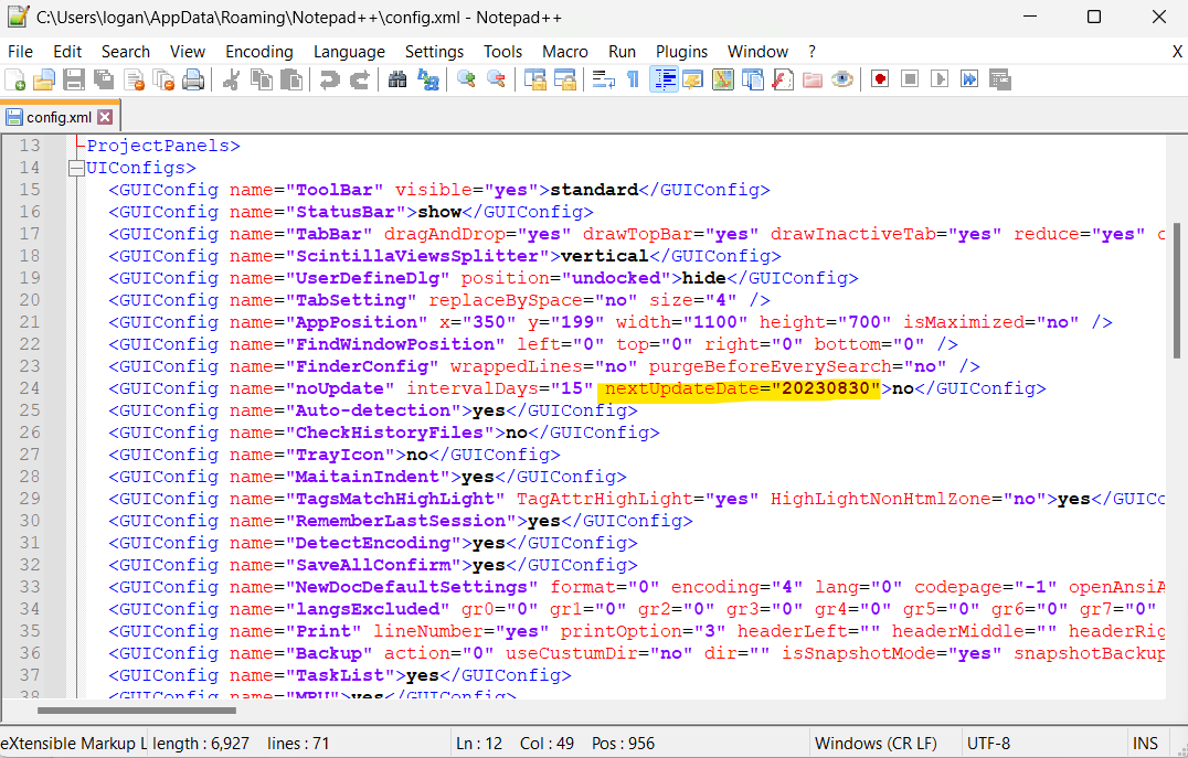 Not every binary is the same, especially when it comes to the loading of a DLL or creating a new process. Remember that GUP.exe only ran on the first install? Well if we look deeper we can see from a simple Google search that Notepad++ runs its updater executable every 15 days on launch. How can this be used in an engagement without knowing when Notepad++ will update? Taking it a step further looking at Notepad++ configuration files, we can see that there’s a section in config.xml for when Notepad++ should update in Figure 3.