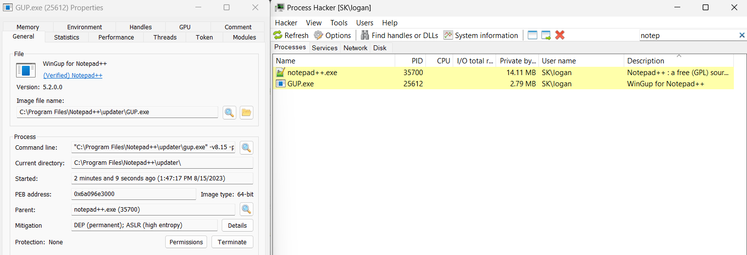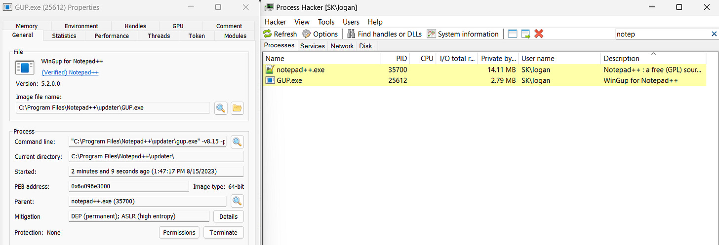 Now that you found an interesting binary let’s see if we can sideload it. In my case, I will be using Notepad++. If you install Notepad++ for the first time you’ll notice an update GUI box appear on your screen. Generally speaking, I like to look for binaries that launch other binaries when looking for sideloadable binaries for evasion purposes. The updater executable is called GUP.exe, you can find what binaries are being launched by a process via a tool such as Process Hacker.